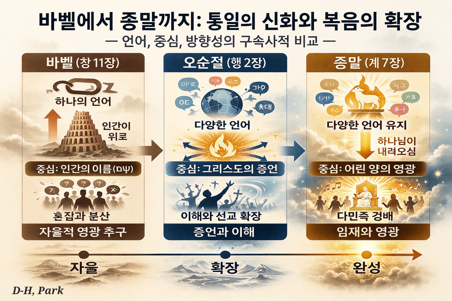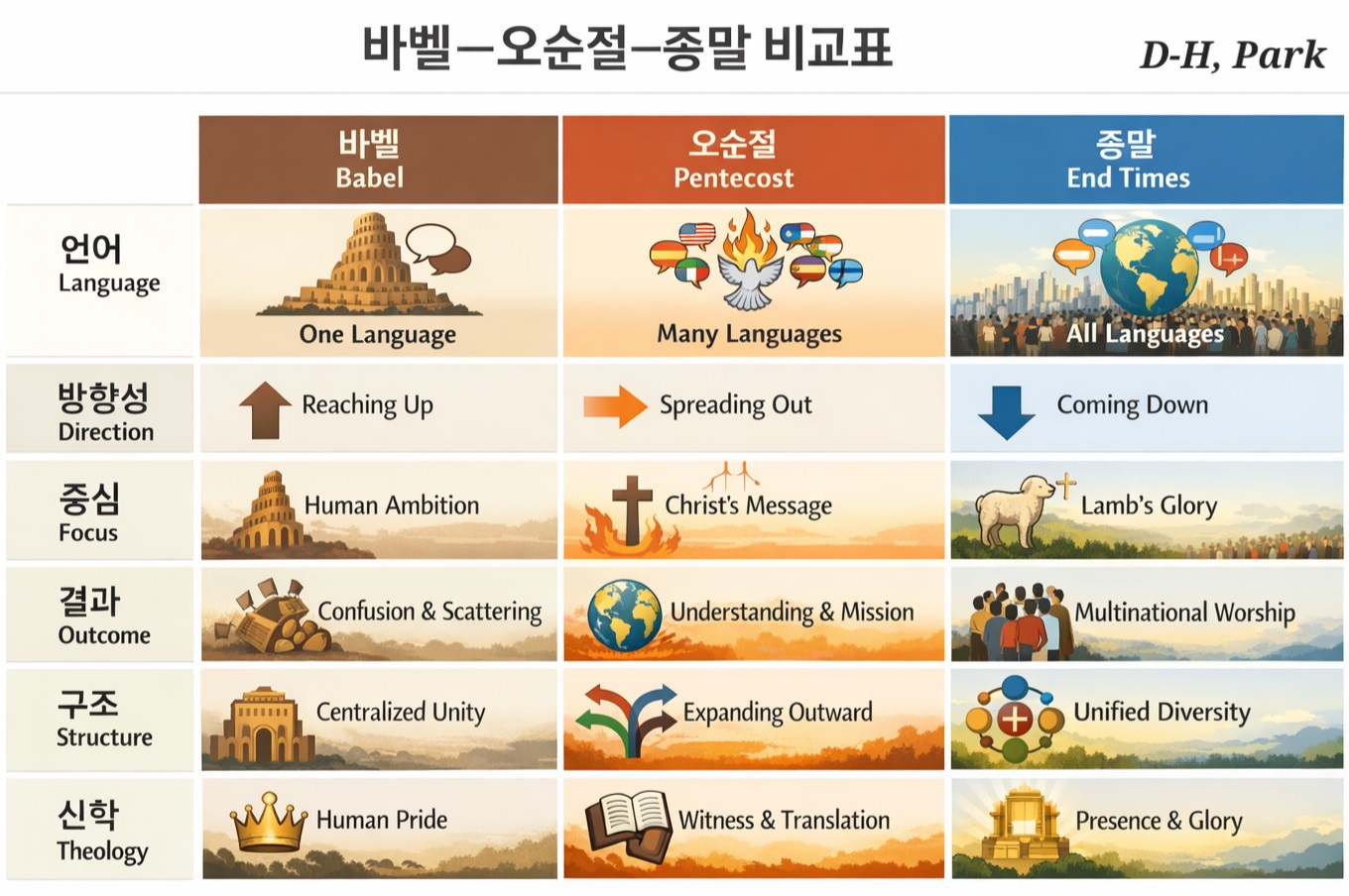 구분 바벨 (창 11) 오순절 (행 2) 종말 (계 7)