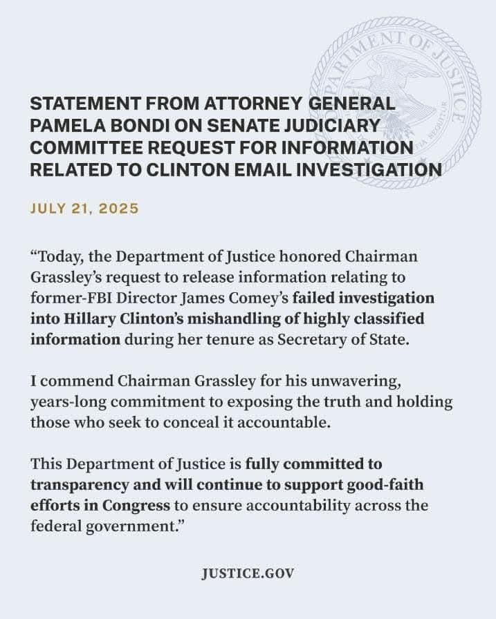 2025년 7월 21일, 법무부는 척 그래슬리 상원의 요청에 따라 힐러리 클린턴 전 국무장관의 이메일 사건 관련 수사 자료를 상원에 제출했다.
